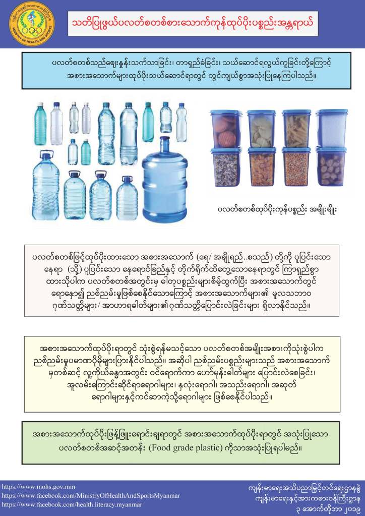 Health Messages သတိပြုဖွယ် ပလတ်စတစ် စားသောက်ကုန်ထုပ်ပိုးပစ္စည်း အန္တရာယ် November 19, 2019 Ronalki Leave a comment Download as PDF Download